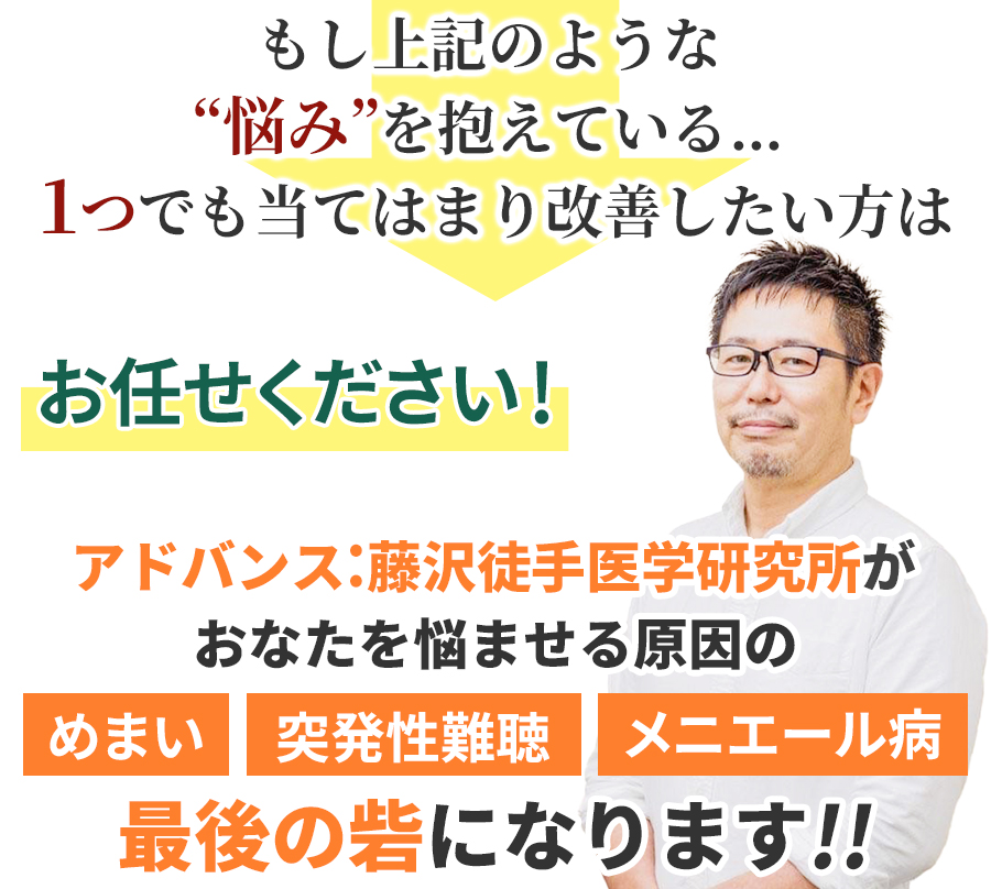 アドバンス:藤沢徒手医学研究所なら『めまい・突発性難聴・メニエール病』によって日々つらい思いをしているあなたのお悩みを解決することができます。