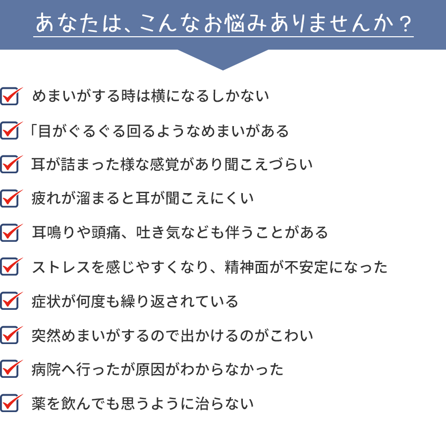 30~50代女性の発症率が高く、数分~数時間続く回転性のめまい発作が不定期に繰り返し起こるのが大きな特徴です。
