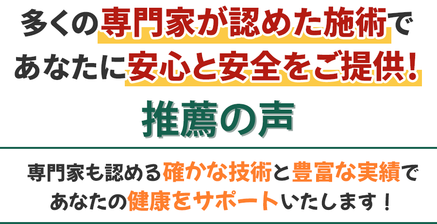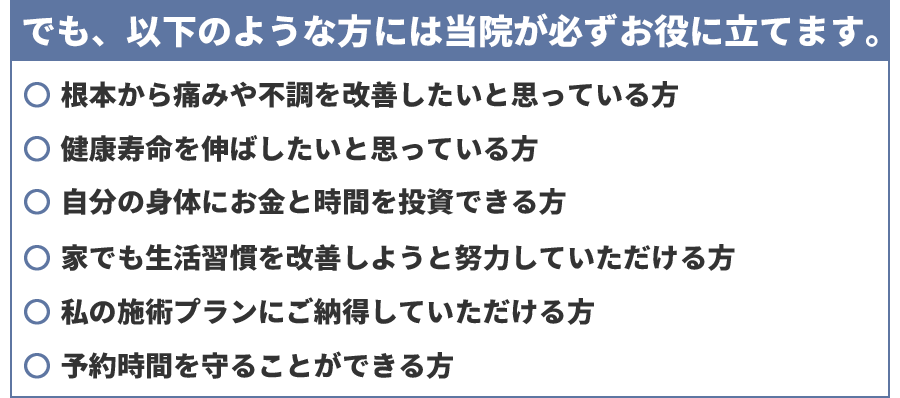 ご自身の技術で良くできる症状と、本当に医療の力が必要な症状を見極めることできる知識と技術を持っています。